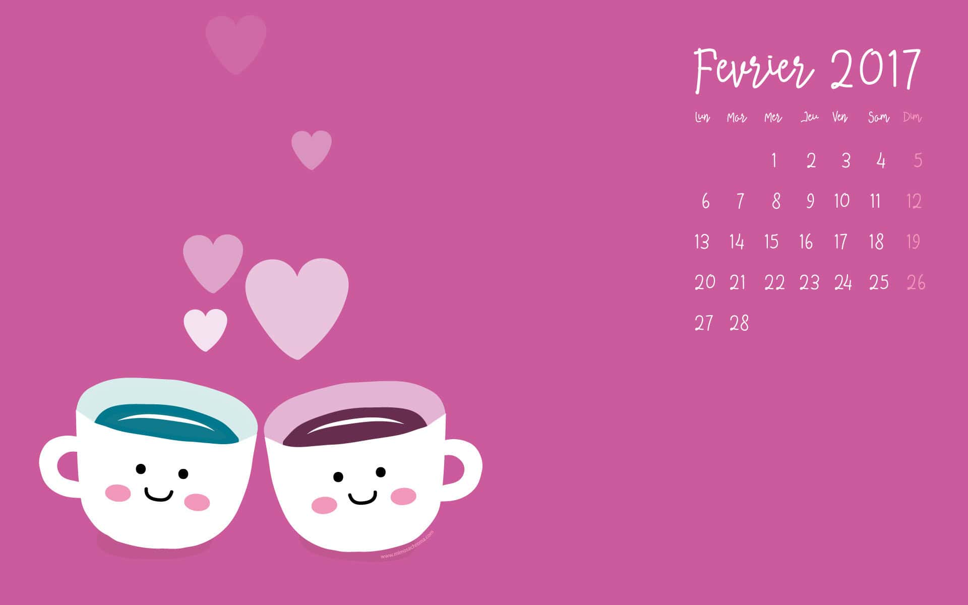 Bientôt Février, donc nouveau calendrier à télécharger avec des petites tasses de chocolat aux couleurs de la Saint-Valentin !