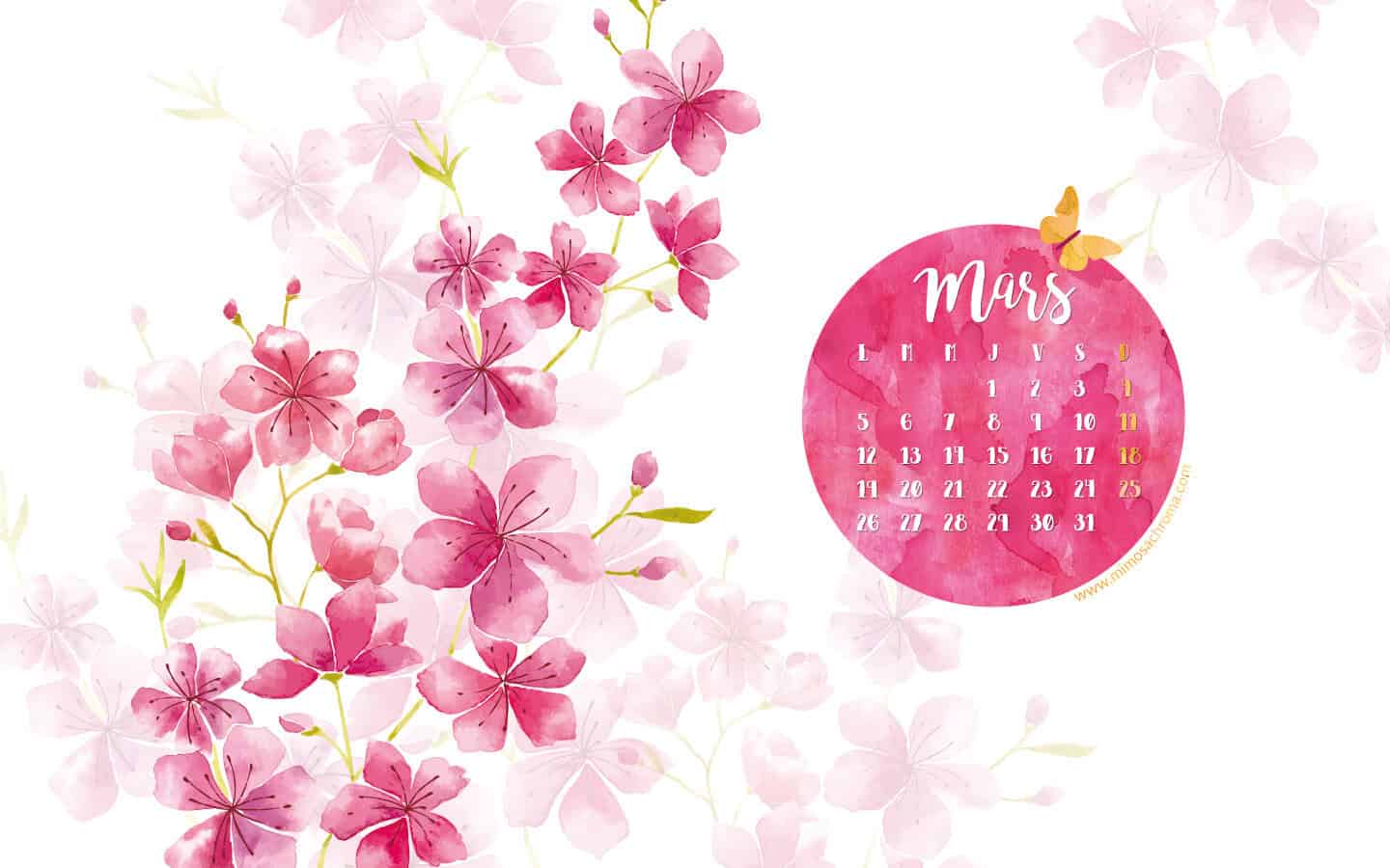 Je vous ai également préparé le calendrier du mois en avance pour pouvoir vous le poster et que vous l’ayez en temps et en heure. Je suis partie sur un esprit printanier avec des fleurs de cerisier pour ce mois-ci en espérant que le beau temps pointe bientôt le bout de son nez…!