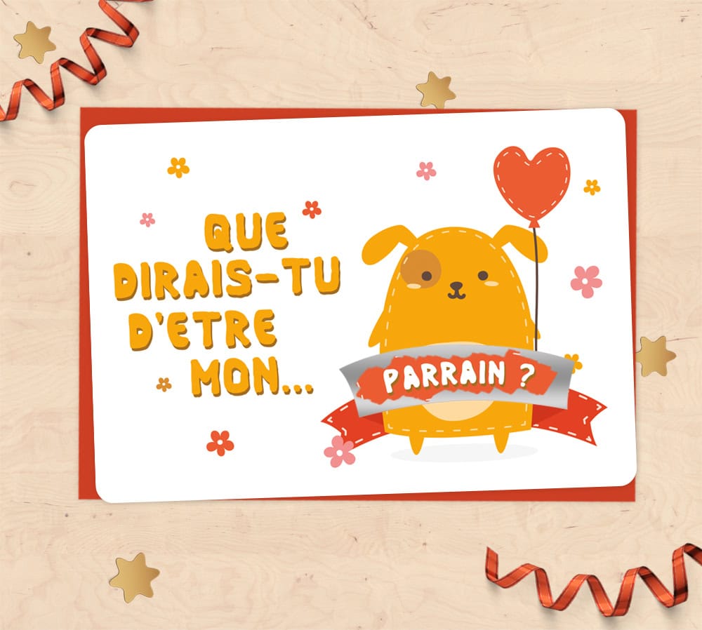 Carte à gratter pour faire votre demande de parrain ou marraine de manière amusante. A offrir à la personne de votre choix pour votre bébé ! Carte avec de mignonnes illustrations d’un petit chat ou d’un petit chien tenant un ballon en forme de cœur.
