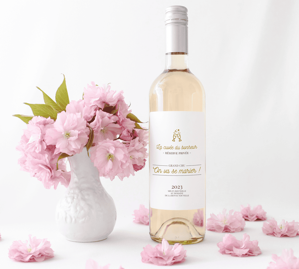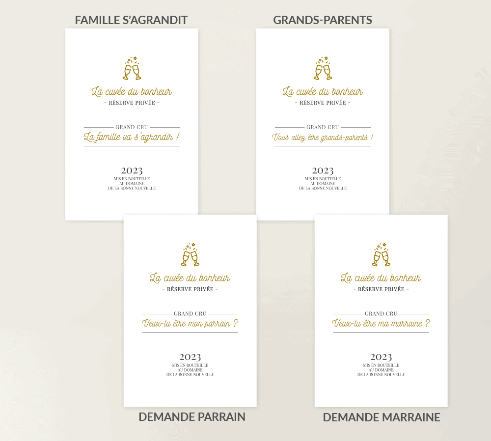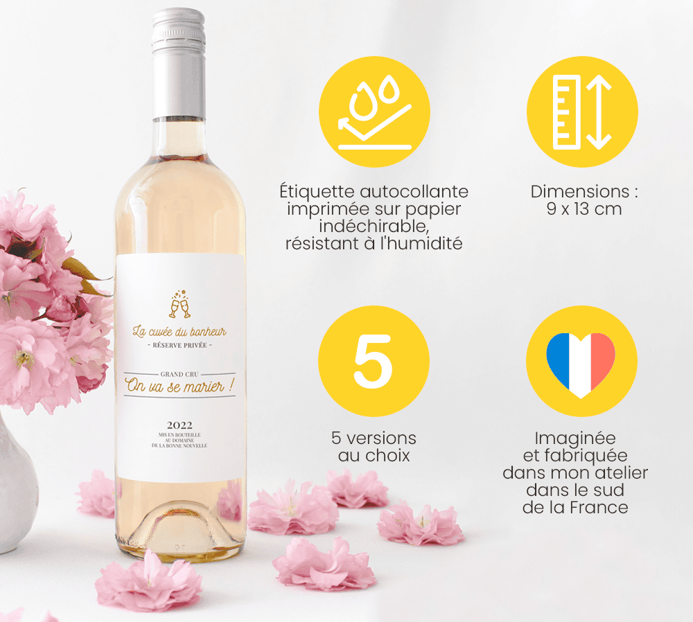 Étiquette autocollante pour personnaliser vos bouteilles de vin ou champagne pour annoncer un heureux événement de manière amusante et originale à vos proches ! Que ce soit à l’occasion d’une prochaine naissance ou l’annonce d’un mariage.