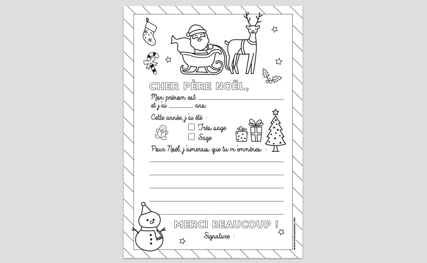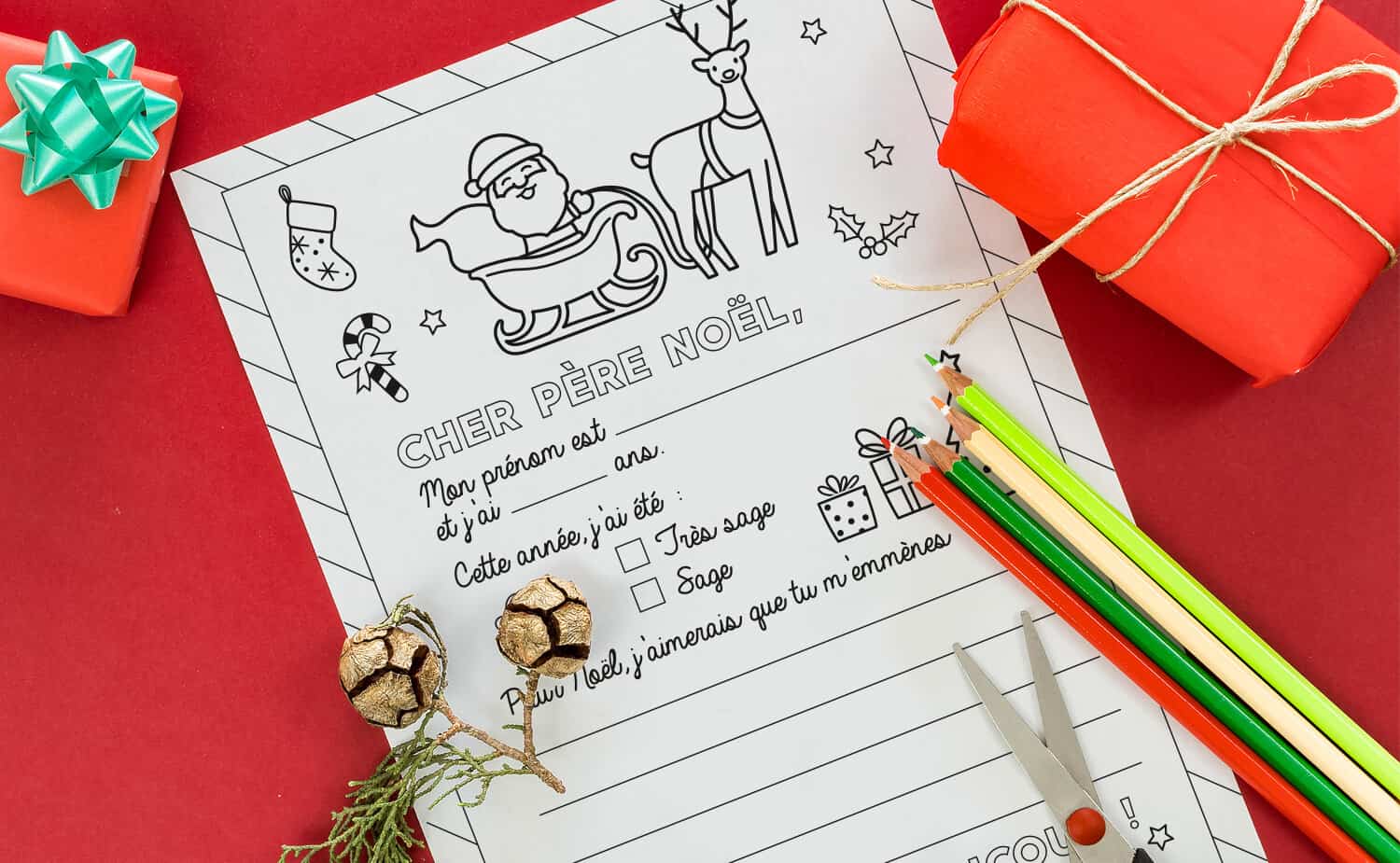 Fichier A4 à télécharger gratuitement pour que vos enfants puissent faire leur lettre au Père Noël grâce à ce modèle à compléter et colorier !
