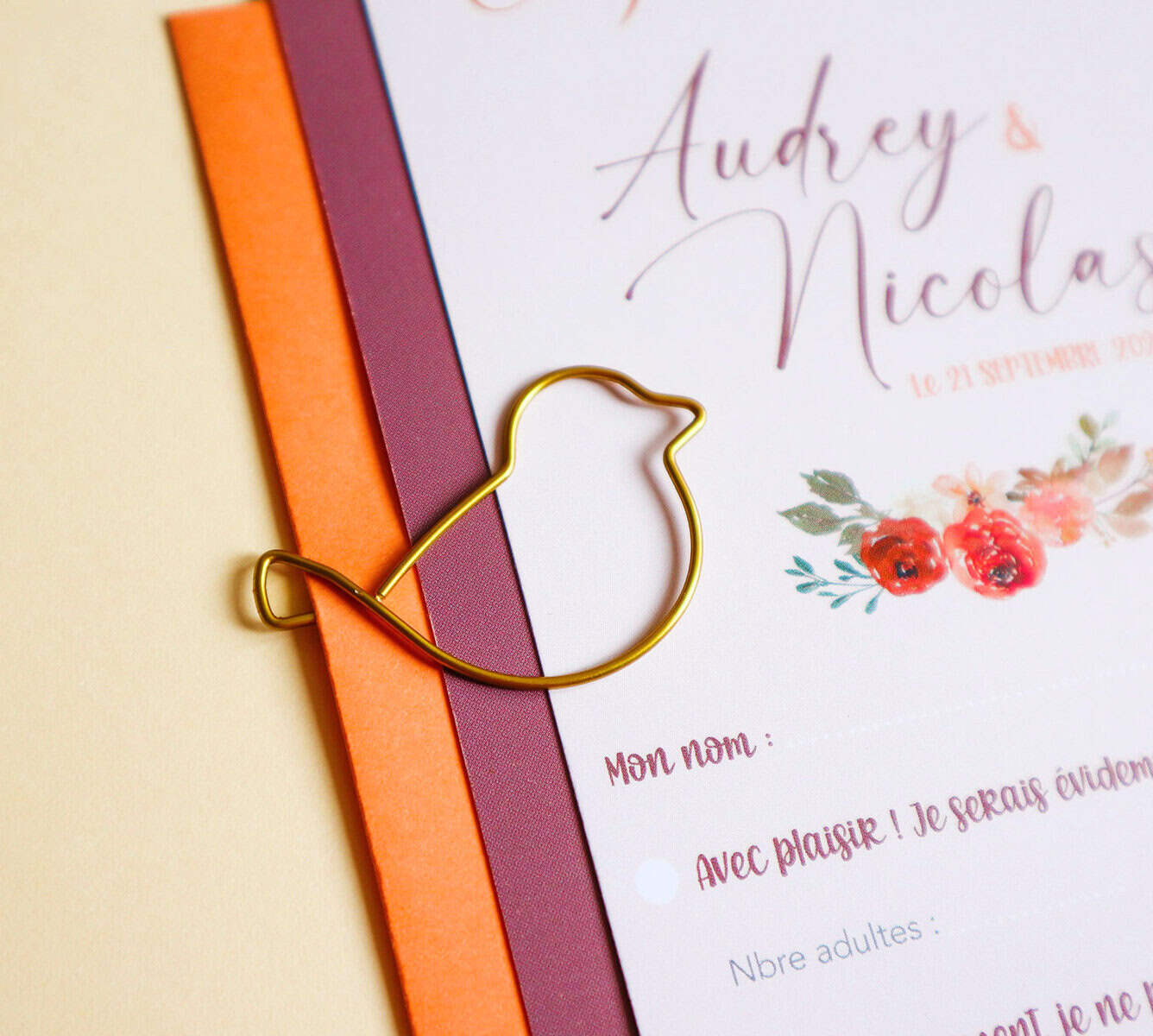 Ces trombones en forme d’oiseau de couleur or vieilli seront l’accessoire idéal pour ajouter une petite touche en plus à vos faire-part !