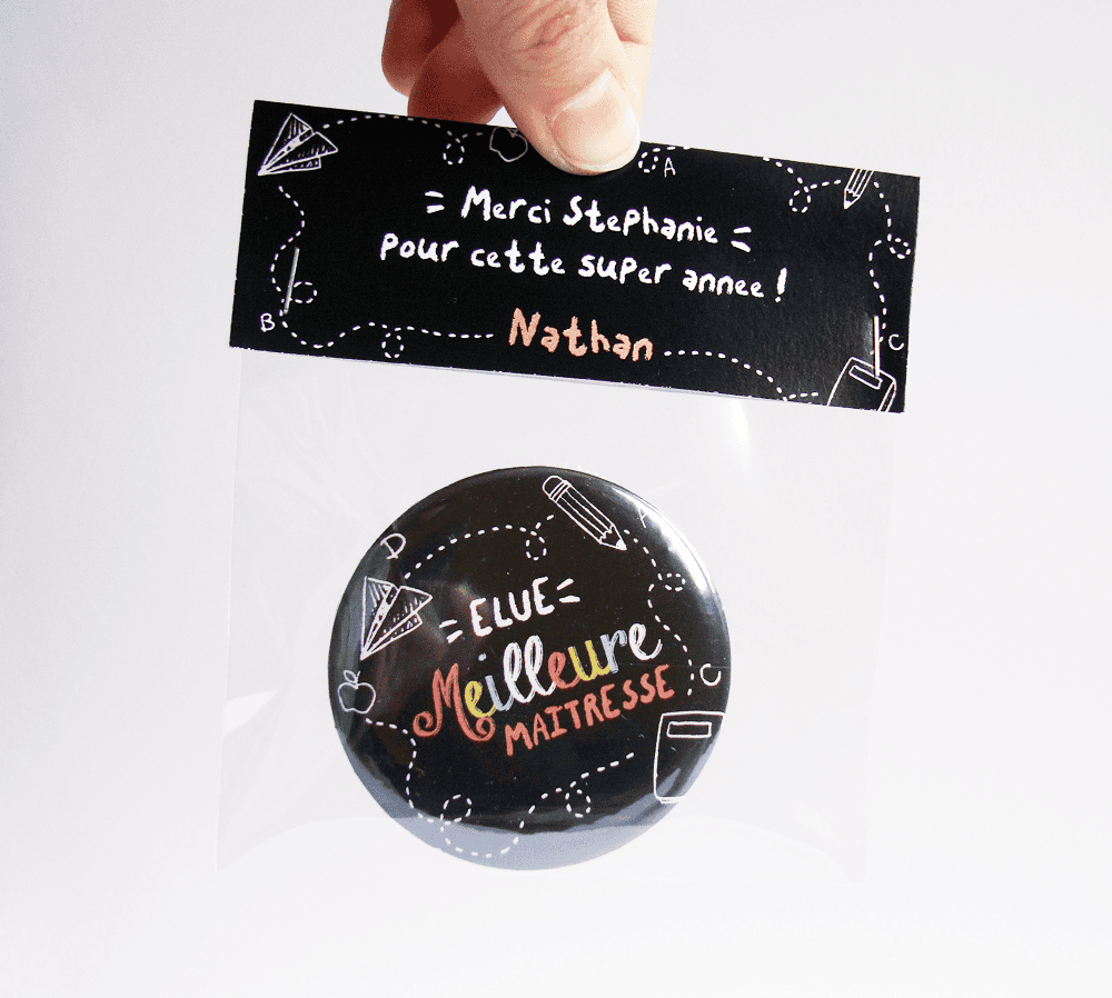 Magnet 56mm pour faire un cadeau de fin d’année aux maîtresses, maîtres, ou ATSEM de votre enfant ! La pochette est personnalisable au prénom de la personne à qui vous allez l’offrir ainsi qu’à celui de votre enfant pour un cadeau unique.