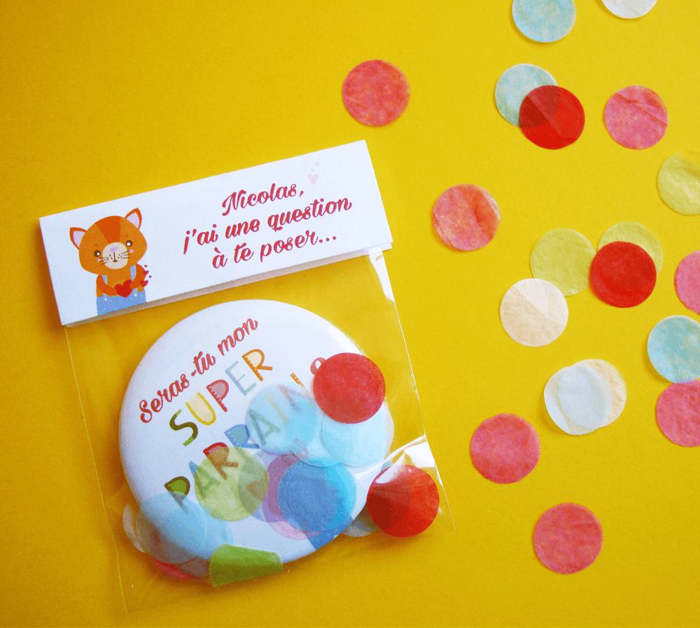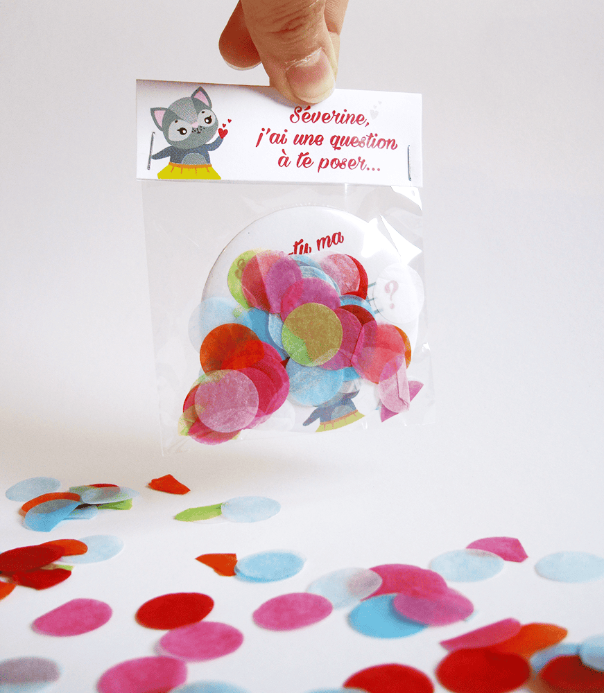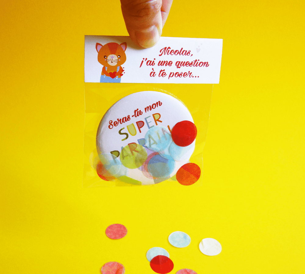Le magnet est présenté dans une pochette transparente remplie de confetti et cette pochette est personnalisable au prénom de la personne à qui vous allez l’offrir pour un cadeau unique.