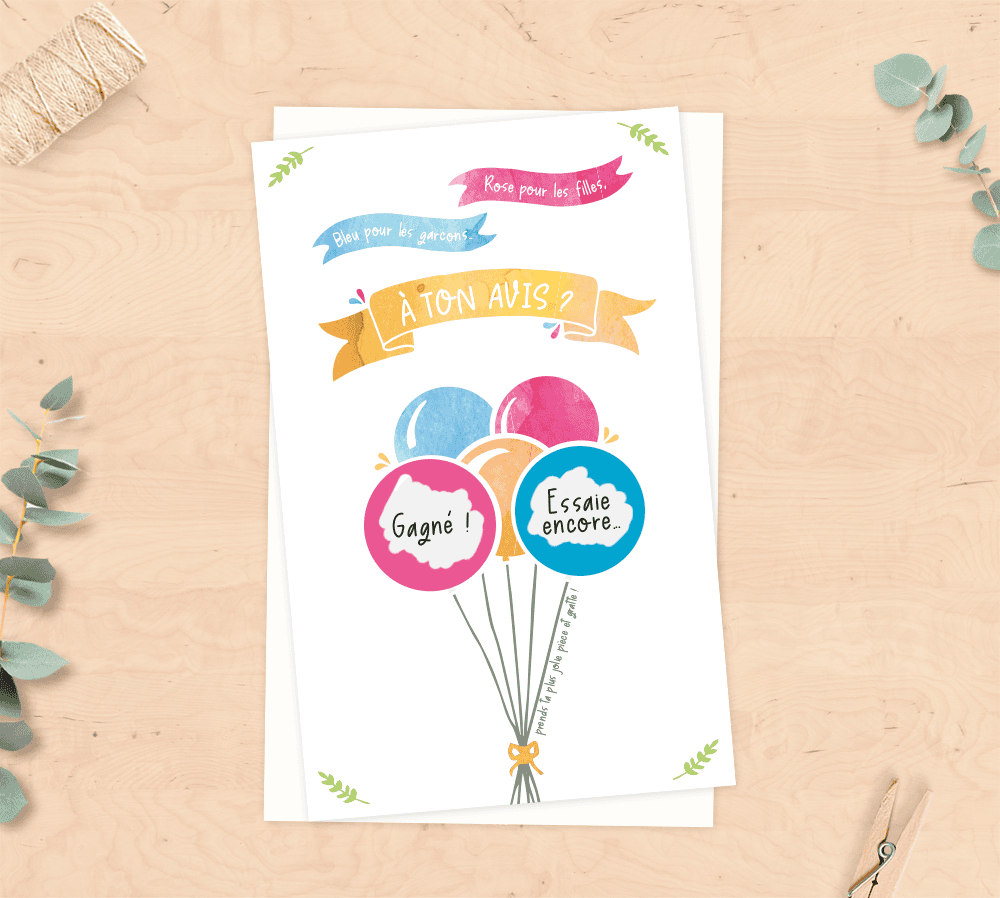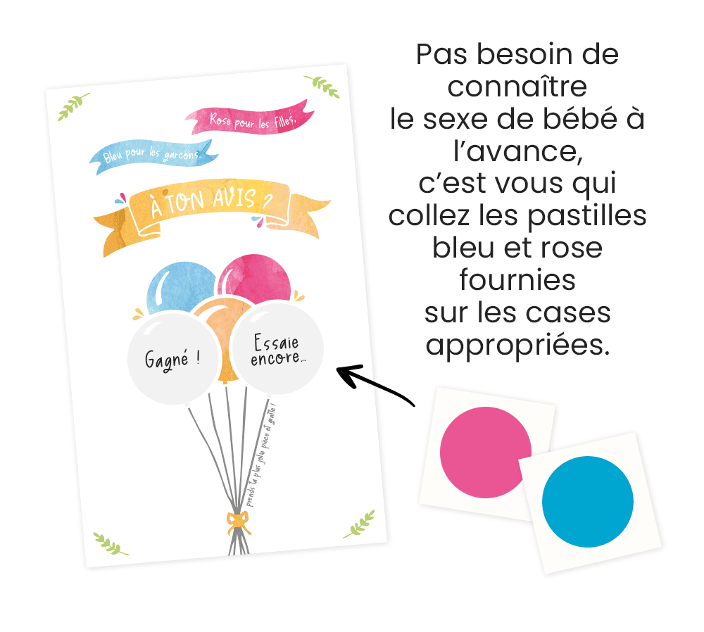 De plus, vous n’avez pas besoin de connaître le sexe de bébé avant de commander ce modèle de cartes car elles vous sont livrés avec 2 pastilles à gratter (1 bleu pour les garçons et 1 rose pour les filles) à placer sur les zones « gagné » et « essaie encore ».
