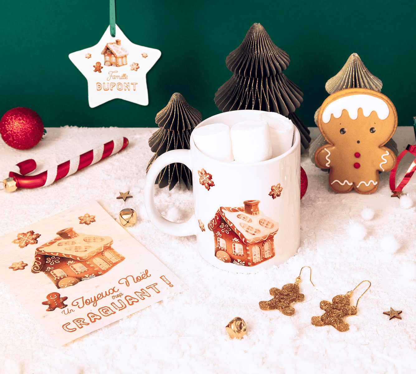 Le thème de ce coffret est « Noël gourmand » avec ces illustrations de maison et bonhomme de pain d’épices. Il contient un mug ainsi qu’une boule de noël personnalisables pour être un cadeau unique et plein d’attention.